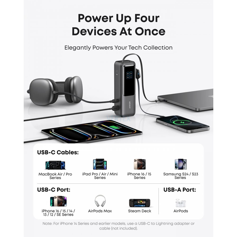 Anker Power Bank оснащений одним портом USB-C (до 100 Вт) та одним USB-A (до 33 Вт), а також двома вбудованими кабелями USB-C (до 100 Вт), що дозволяє заряджати до чотирьох пристроїв одночасно. Один кабель повністю ховається всередину корпусу, другий — виконує ще й роль зручного ремінця для перенесення. Жодних зайвих дротів — усе завжди під рукою.