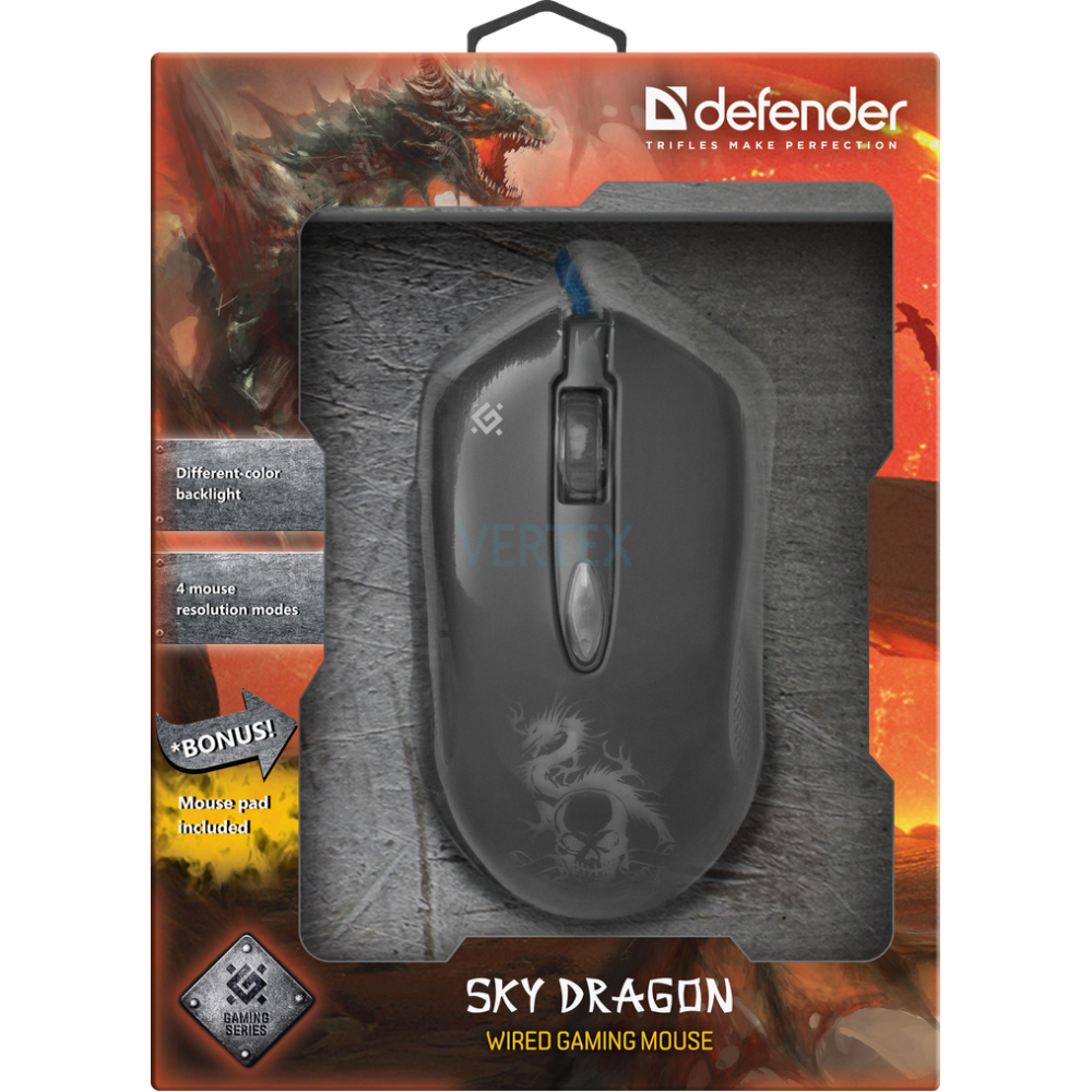 Ігрова миша Defender Sky Dragon GM-090L з підсвічуванням, форма корпусу ідеально підходить для невеликої долоні. Килимок у комплекті.