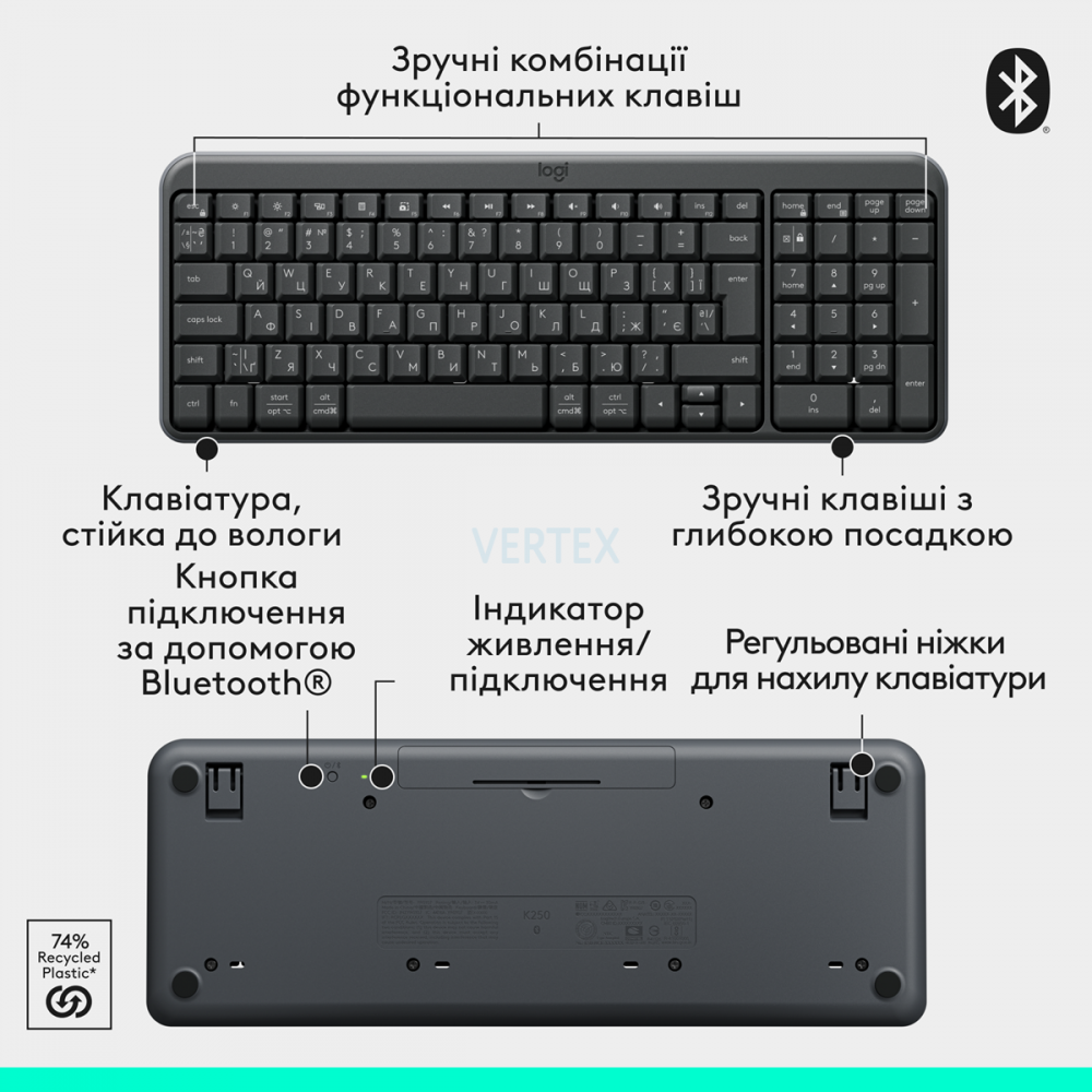 Насолоджуйтеся плавною симетричною формою миші та зручними клавішами з глибокою посадкою клавіатури, яка має захист від вологи. Надсучасна клавіатура MK250 виготовляється компанією Logitech, брендом, відомим своєю якістю з 1981 року, з переробленого пластику.* MK250 поєднує в собі практичність і довговічність в одному компактному, повнофункціональному рішенні.