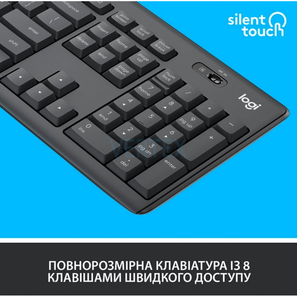 Повнорозмірна клавіатура забезпечує все необхідне в елегантному та ефективному дизайні. 8 зручних клавіш швидкого доступу плюс повна цифрова клавіатура спрощують введення даних і навігацію.