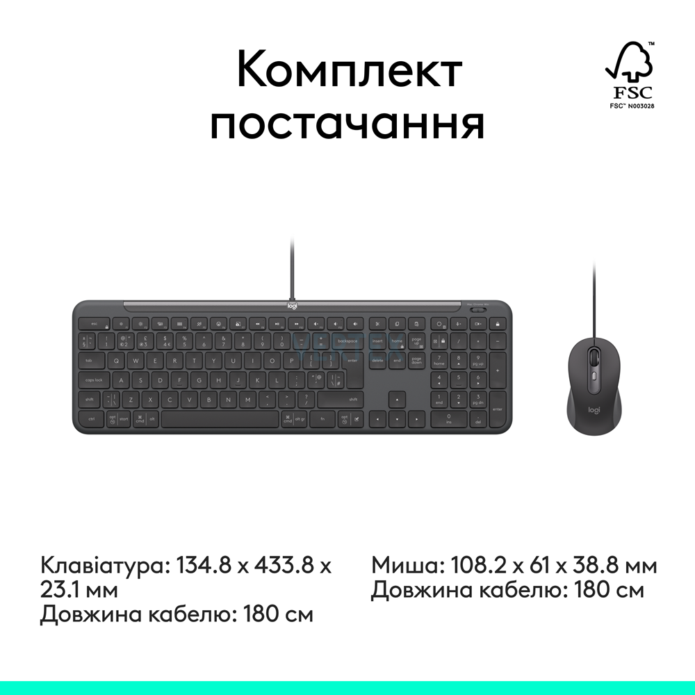 - Виготовлено з переробленого пластику (66% клавіатура, 71% миша)