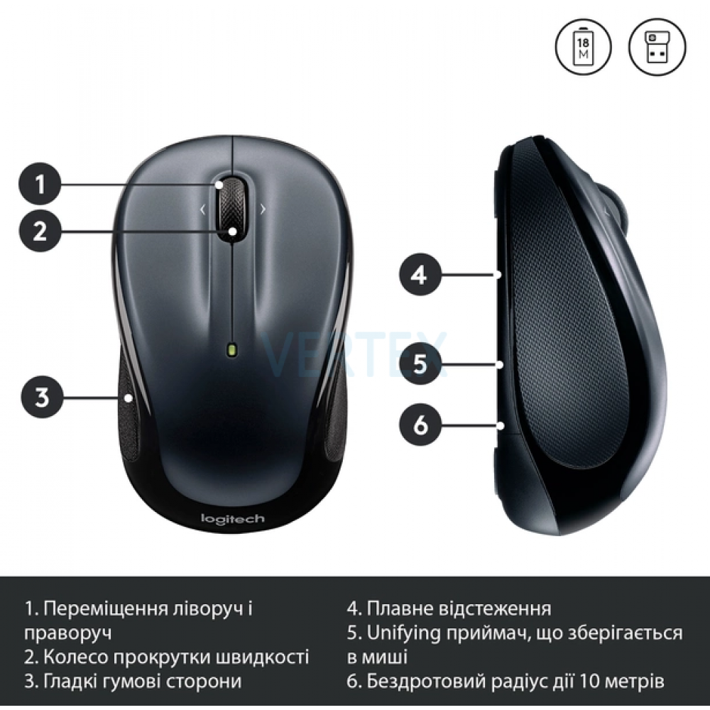 Зручна конструкція цієї миші відповідає природній формі руки, тому працювати з нею можна тривалий час, не відчуваючи втоми. Бездротова миша M325 легко поміститься в сумку разом з ноутбуком - візьміть її із собою в дорогу або скористайтеся вдома для шкільних занять. З цією моделлю можна працювати як правою, так і лівою рукою, а перемикання функцій кнопок здійснюється за допомогою Logitech Options.