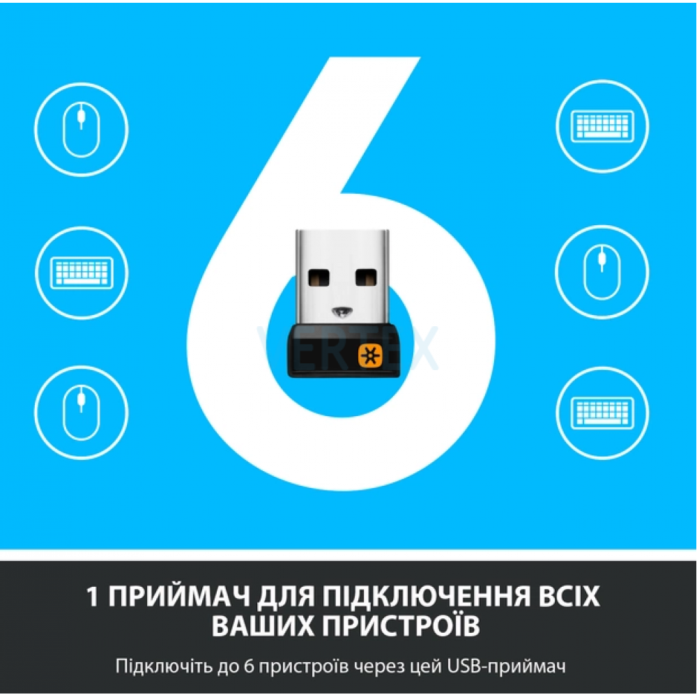 Просто вставте приймач у USB-порт комп'ютера або ноутбука - і можна відразу розпочати роботу. Приймач забезпечує надійне та стабільне під'єднання в радіусі до 10 метрів. Крім того, до одного приймача можна легко під'єднати до шести сумісних периферійних пристроїв із підтримкою технології Logitech Unifying.