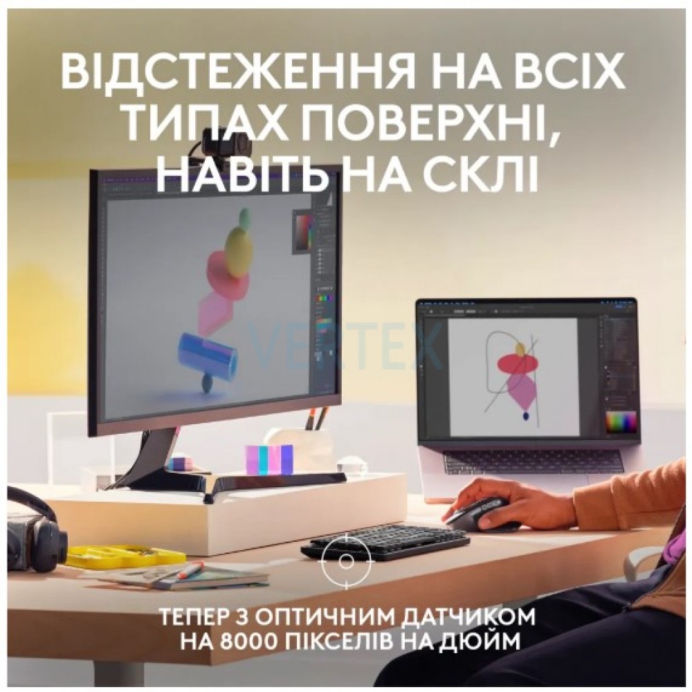 Працюйте на моніторах з великою роздільною здатністю з оптичним сенсором точності 8 000 DPI, який відстежує практично в будь-якому місці - навіть на склі. Налаштуйте чутливість відстеження у Logi Options+.