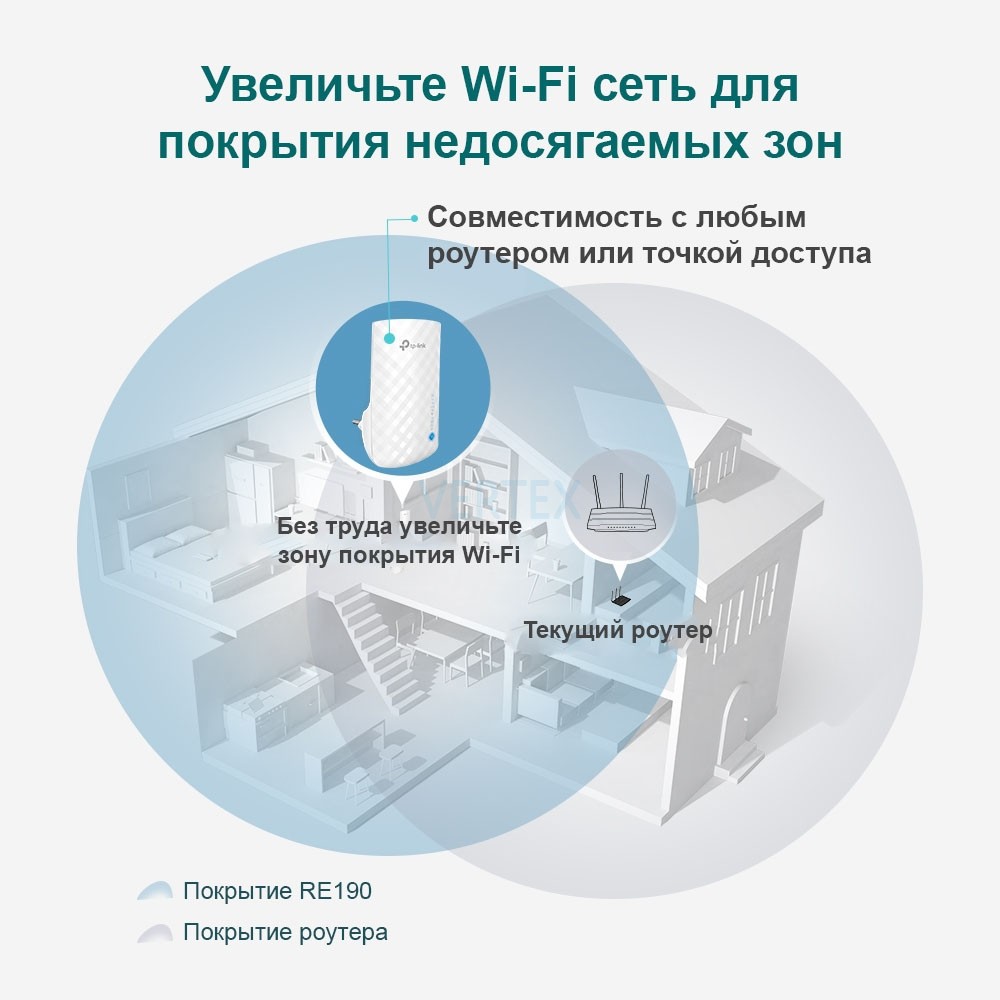 RE190 підтримує стандарт Wi-Fi 802.11ac і створює потужне Wi-Fi під'єднання у всьому будинку. Він працює з будь-яким роутером або точкою доступу, зручно надаючи широке дводіапазонне покриття для багатьох пристроїв.